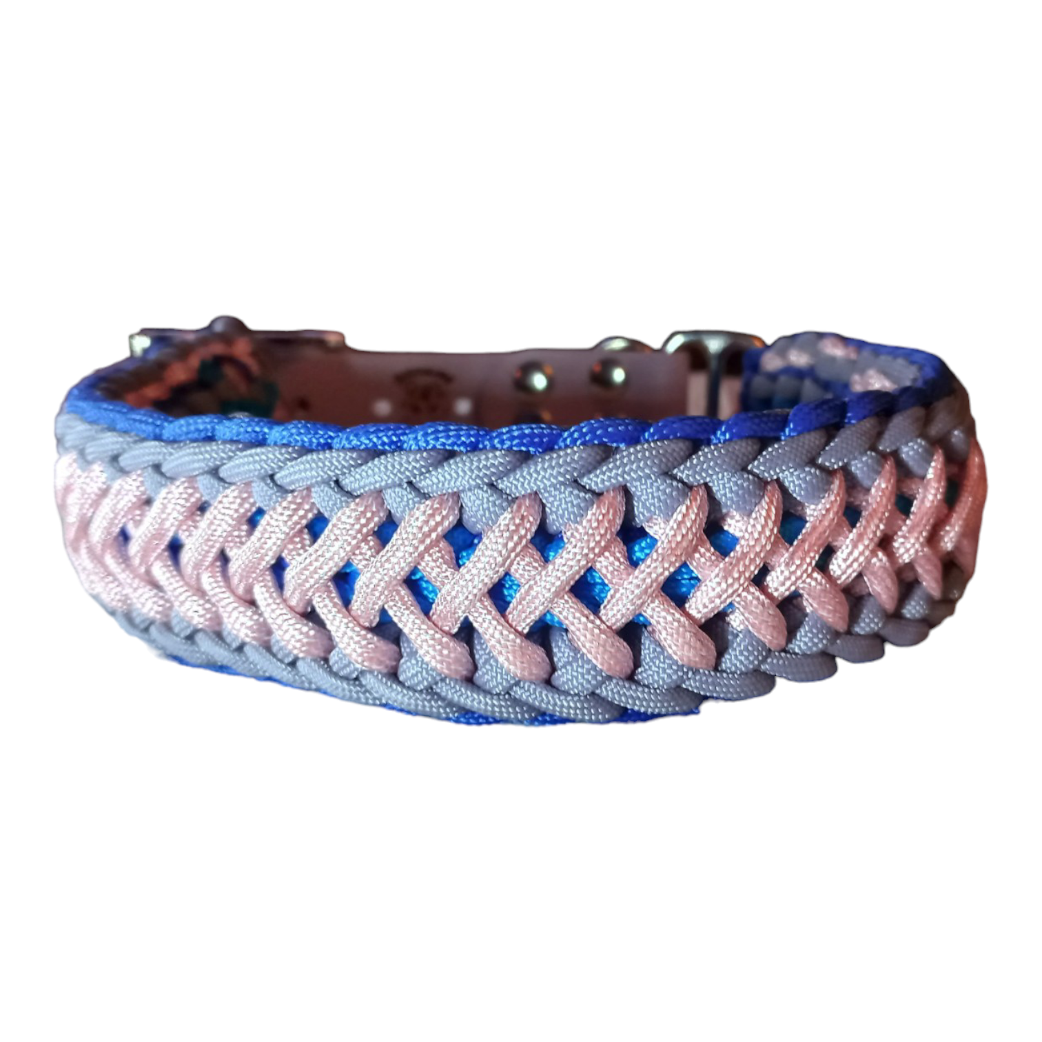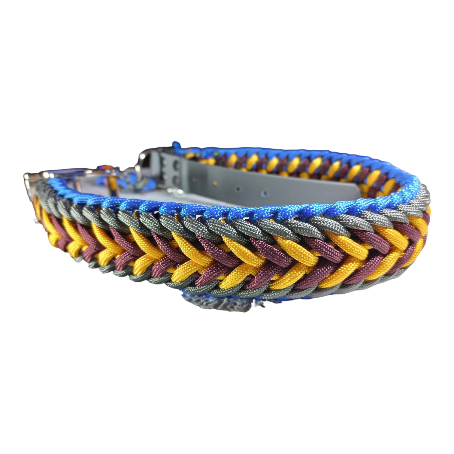 De halsband is ca. 1,6 cm dik en 3 cm breed. Het kan met sierkleur (hier goud) of zonder uitgevoerd worden.